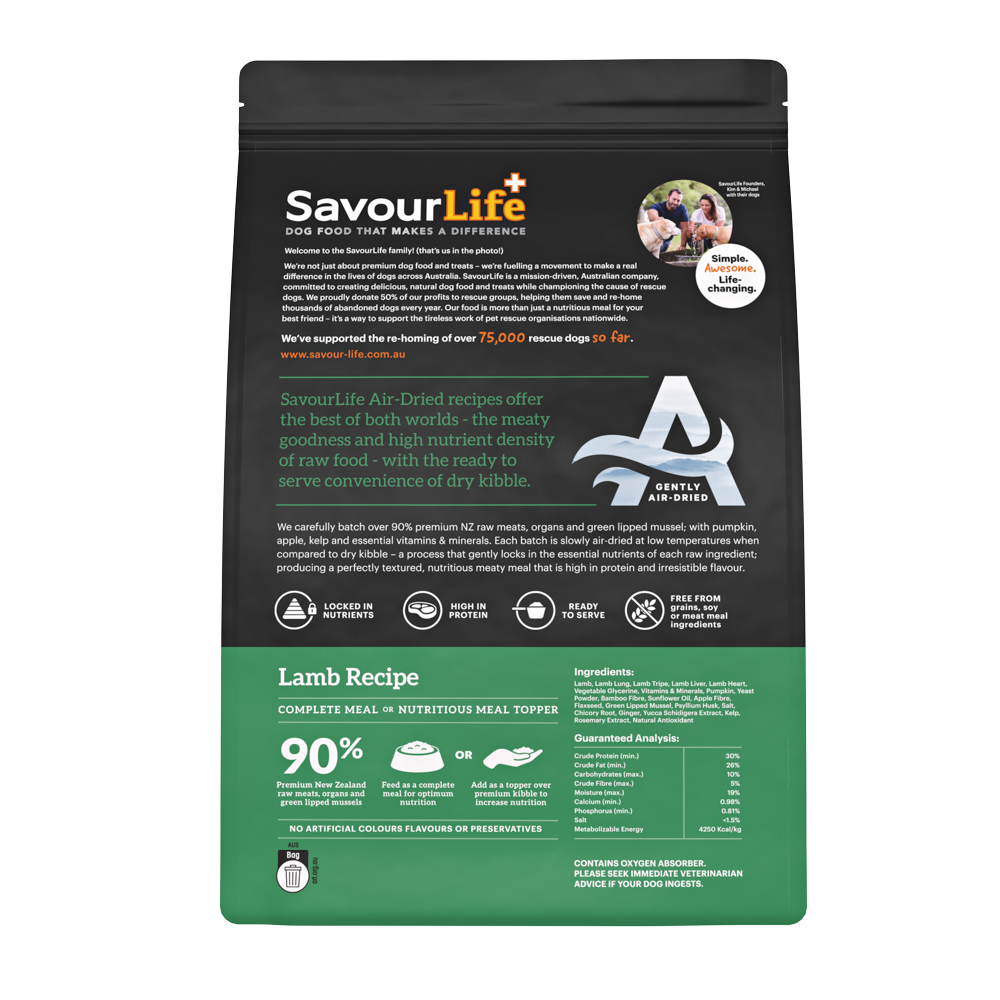 SavourLife Air-Dried recipes offer the best of the both worlds - the meaty goodness and high nutrient density of raw food - with the ready to serve convenience of dry kibble.