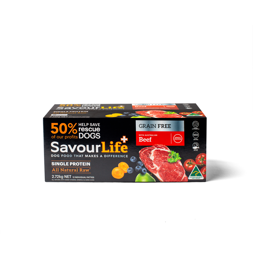 SavourLife’s All Natural Raw Frozen dog food consists primarily of raw meat, a rich source of amino acids which play a key part in many bodily functions like supporting muscle activity, transporting nutrients and oxygen around the body, building and repairing tissue as well as supporting the immune system. Finely ground beef bone and cartilage provide a natural source of phosphorus and calcium that is important for many functions including healthy teeth and bones. Offal including Beef heart and liver is a good source of iron which helps create red blood cells in the body.