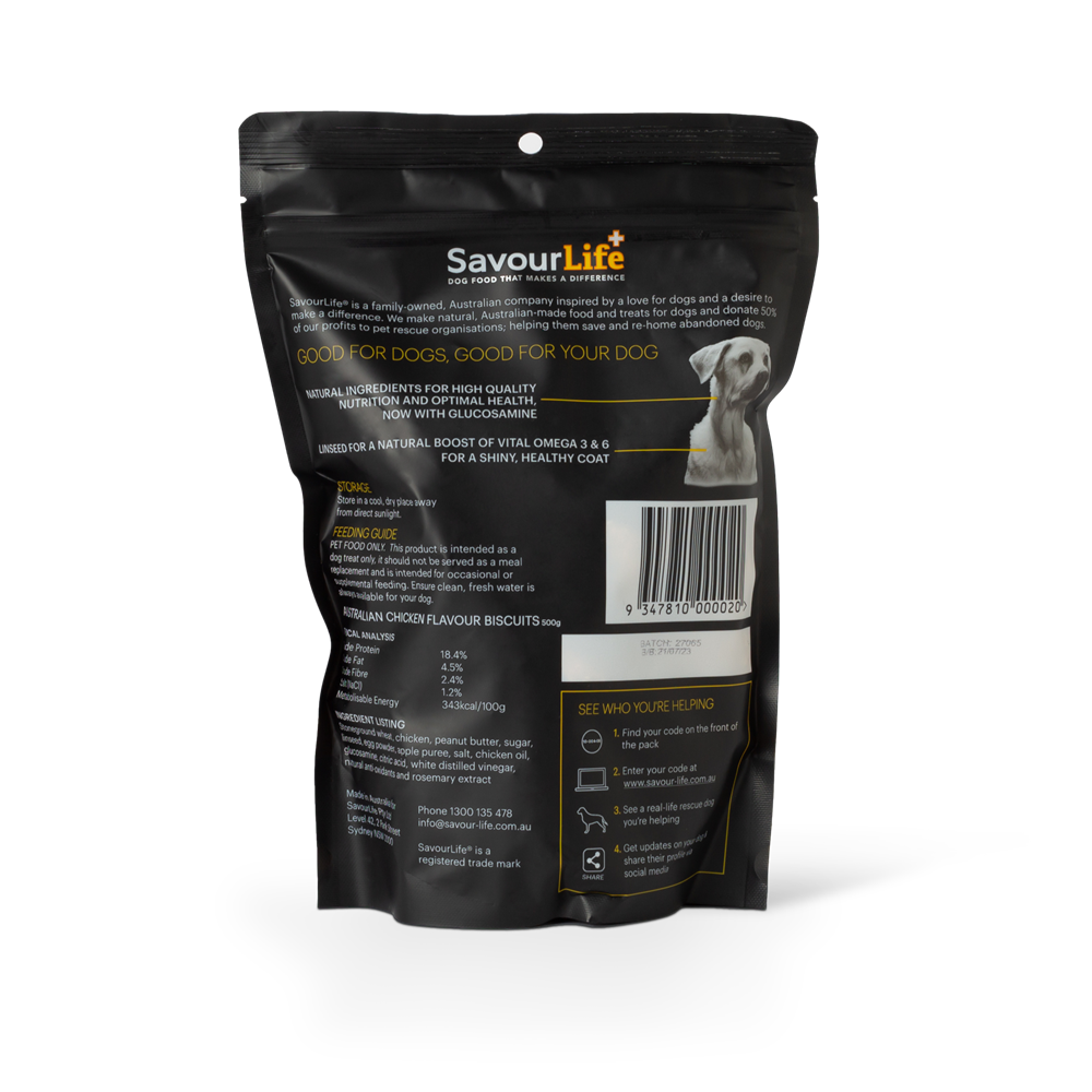 SavourLife's all-natural, oven-baked Australian Chicken Flavour Biscuits contain no artificial flavours, colours or preservatives. Our protein-packed biscuits are made from Australian ingredients including real Australian chicken, eggs and whole linseed. We use only the best natural ingredients for optimal health and nutrition, then we bake them to perfection, giving them a crunchy texture, which is great for promoting healthy teeth and gums. The perfect choice for a healthy and delicious treat for your dog!