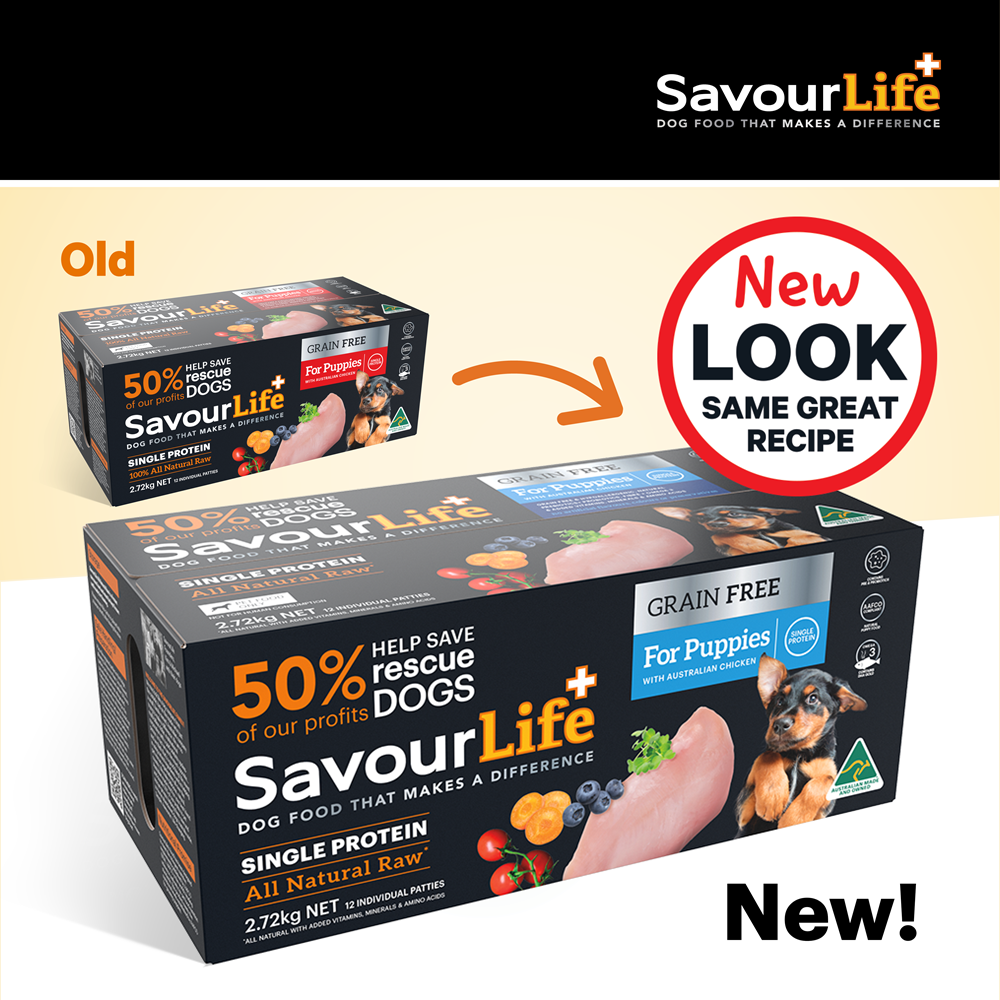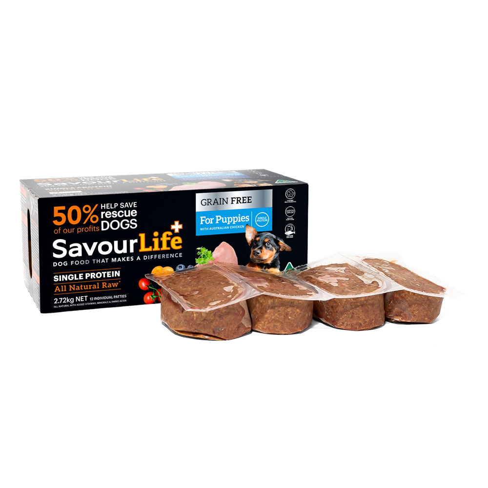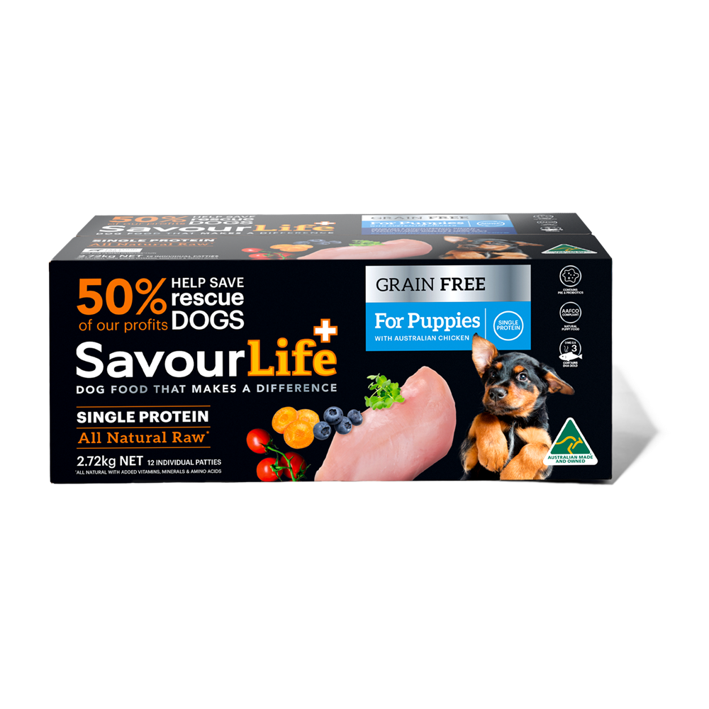 Our All Natural Raw Puppy Chicken Frozen food, is a Single Protein meal that is filled with the finest natural Australian ingredients. With superfood inclusions like blueberries, broccoli, tomatoes, carrot, apples and flaxseeds; plus vitamins, minerals, natural pre-biotics, probiotics and amino acids. Plus, it’s grain free, gluten free and hypoallergenic, and contains no artificial colours, flavours or preservatives.