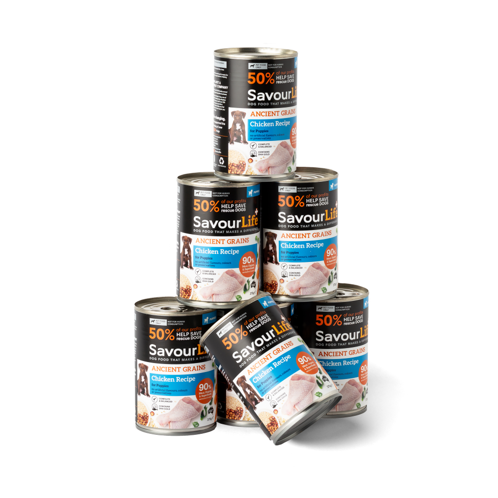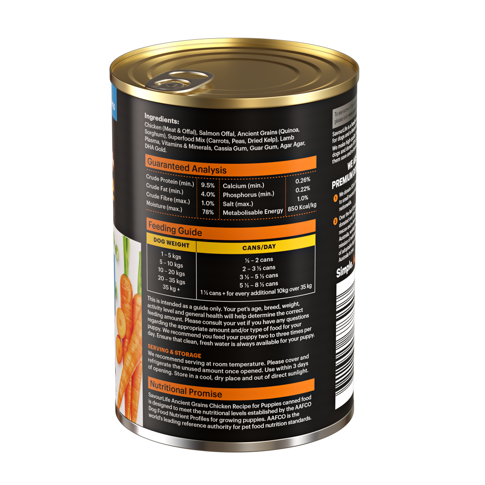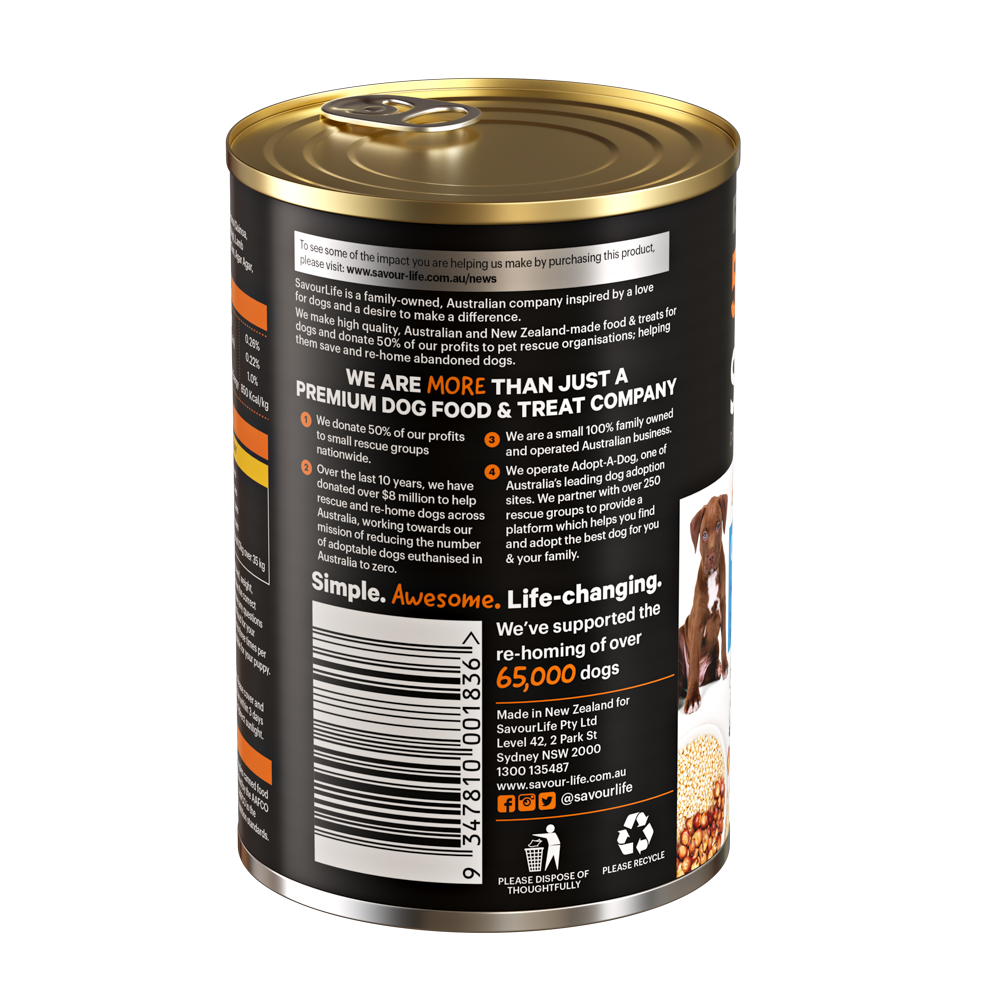 SavourLife's Ancient Grain’s canned dog food recipes have been specially batched to consist of 90% Meat, Organs and Superfoods; and topped with all the essential vitamins & minerals to create a complete and balanced meal. The result is an irresistibly tasty, loaf-like meaty food that is packed with nutrients that closely mimic your dog’s ancestral diet ensuring they thrive every day.