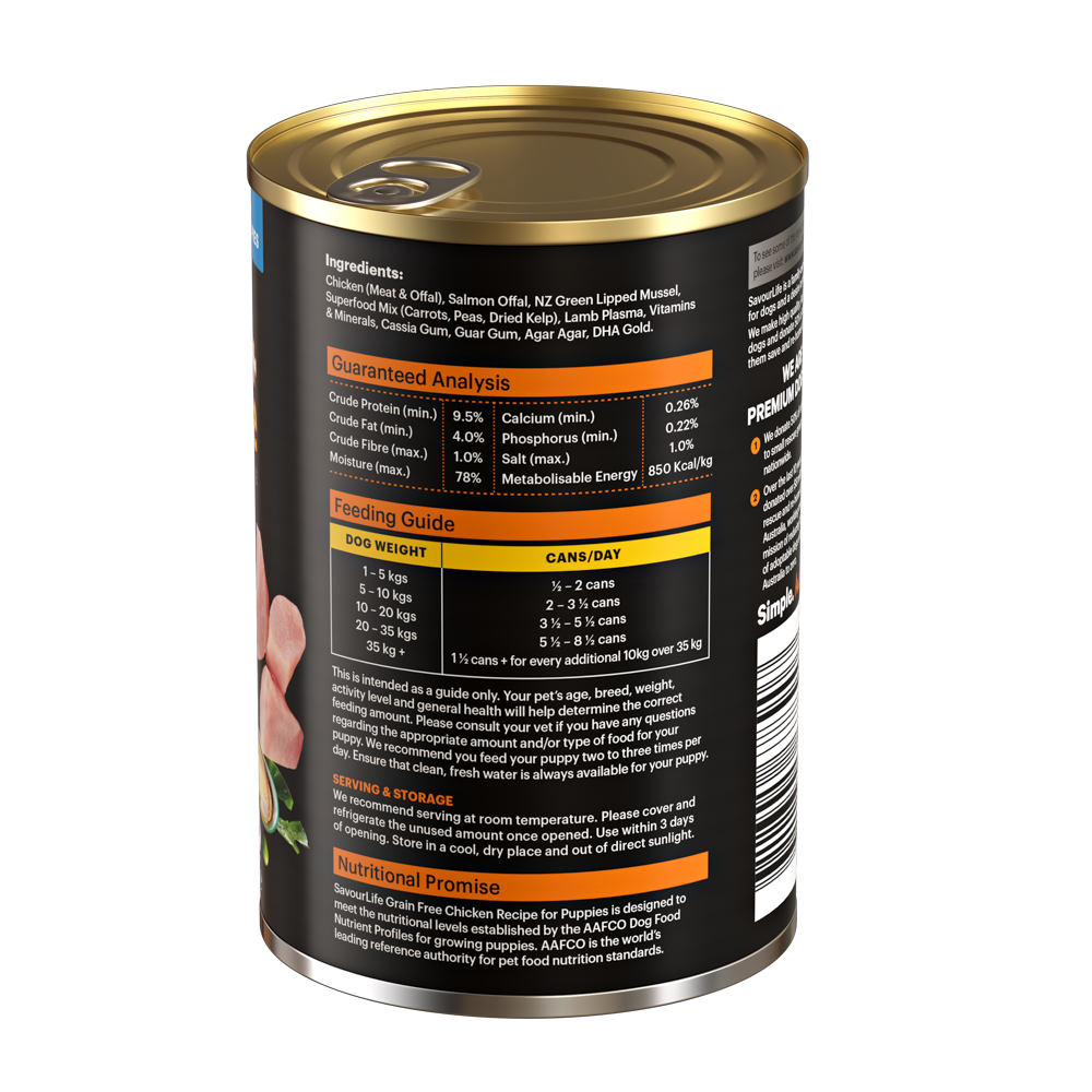 SavourLife's Grain Free canned dog food recipes have been specially batched to consist of 95% Meat, Organs, New Zealand Green Lipped Mussel and Superfoods; and topped with all the essential vitamins & minerals to create a complete and balanced meal. The result is an irresistibly tasty, loaf-like meaty food that is packed with nutrients that closely mimic your dog’s ancestral diet ensuring they thrive every day.